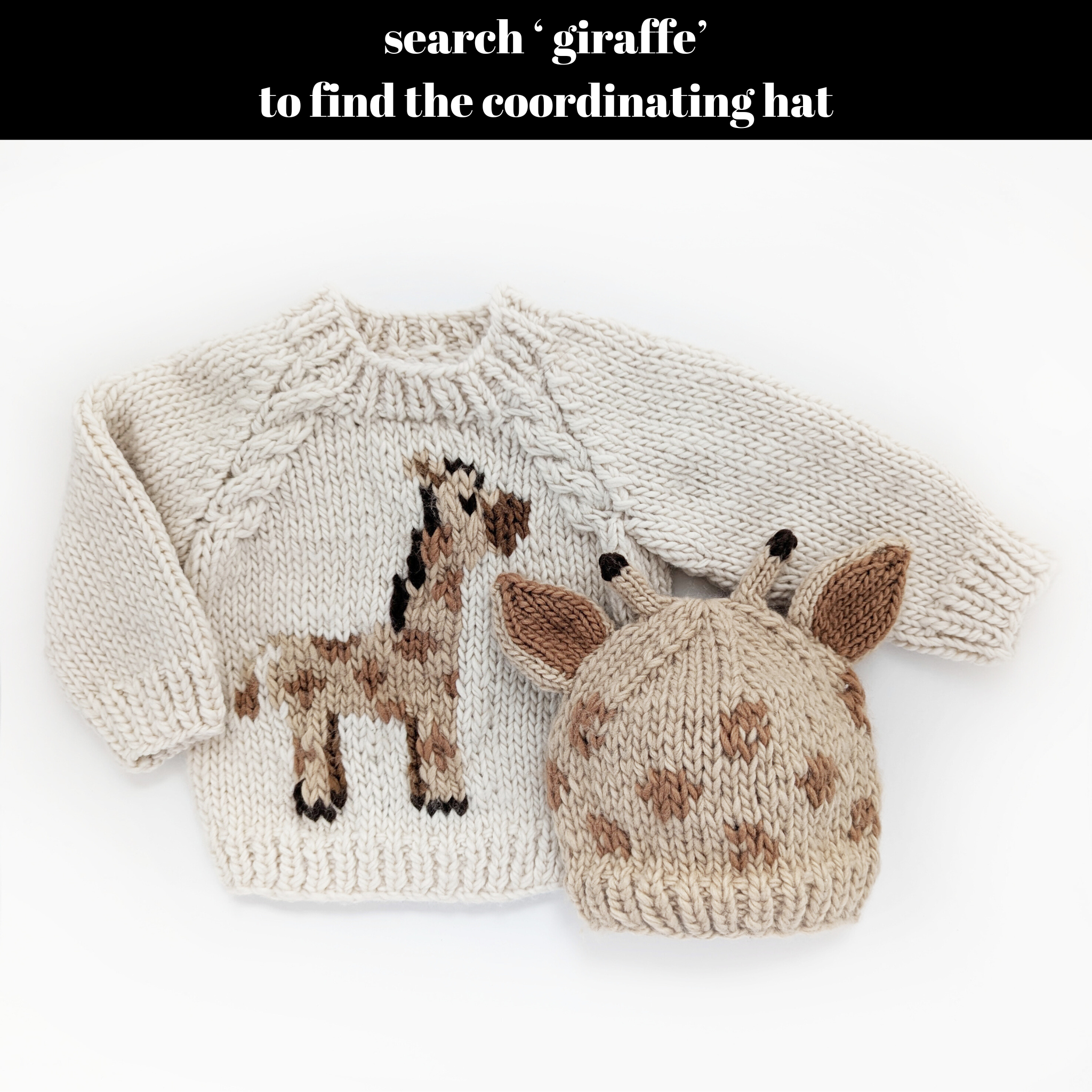 Keep your little one snuggled up in style with this cozy, hand-knit Giraffe Sweater. Not only will it make them look absolutely adorable, but the raglan sleeves and cable details make for a unique and fun twist. Don't forget to complete the look with our coordinating Giraffe Beanie Hat! Our sweaters are partially knit from recycled, sustainable Polyester yarn made from plastic bottles. We are on a mission to help reduce the world's plastic pollution problem ♻ • Hand Knit • 60% Acrylic, 40% Recycled Polyester • Hand Wash • Designed in our Coachella Valley, CA studio