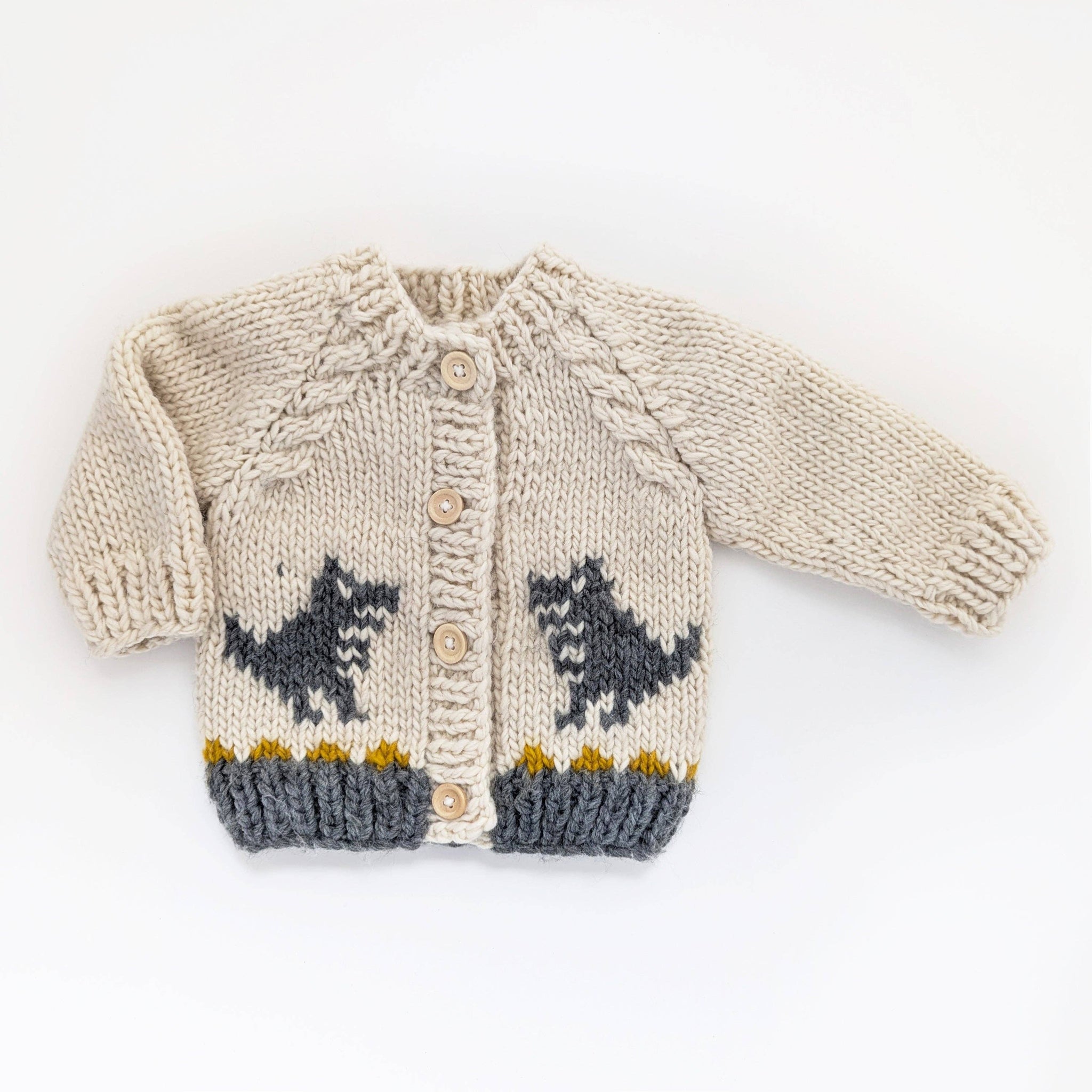 Unleash your inner T-Rex with this hand-knitted, cozy T-Rex cardigan made from soft, Natural-colored yarn. Featuring wood buttons and two T-Rex dinos on the front in a playful Grey and Saffron color scheme, complete the look with our matching T-Rex beanie! Our sweaters are partially knit from recycled, sustainable Polyester yarn made from plastic bottles. We are on a mission to help reduce the world's plastic pollution problem ♻ • Hand Knit • 60% Acrylic, 40% Recycled Polyester • Hand Wash • Designed in our Coachella Valley, CA studio