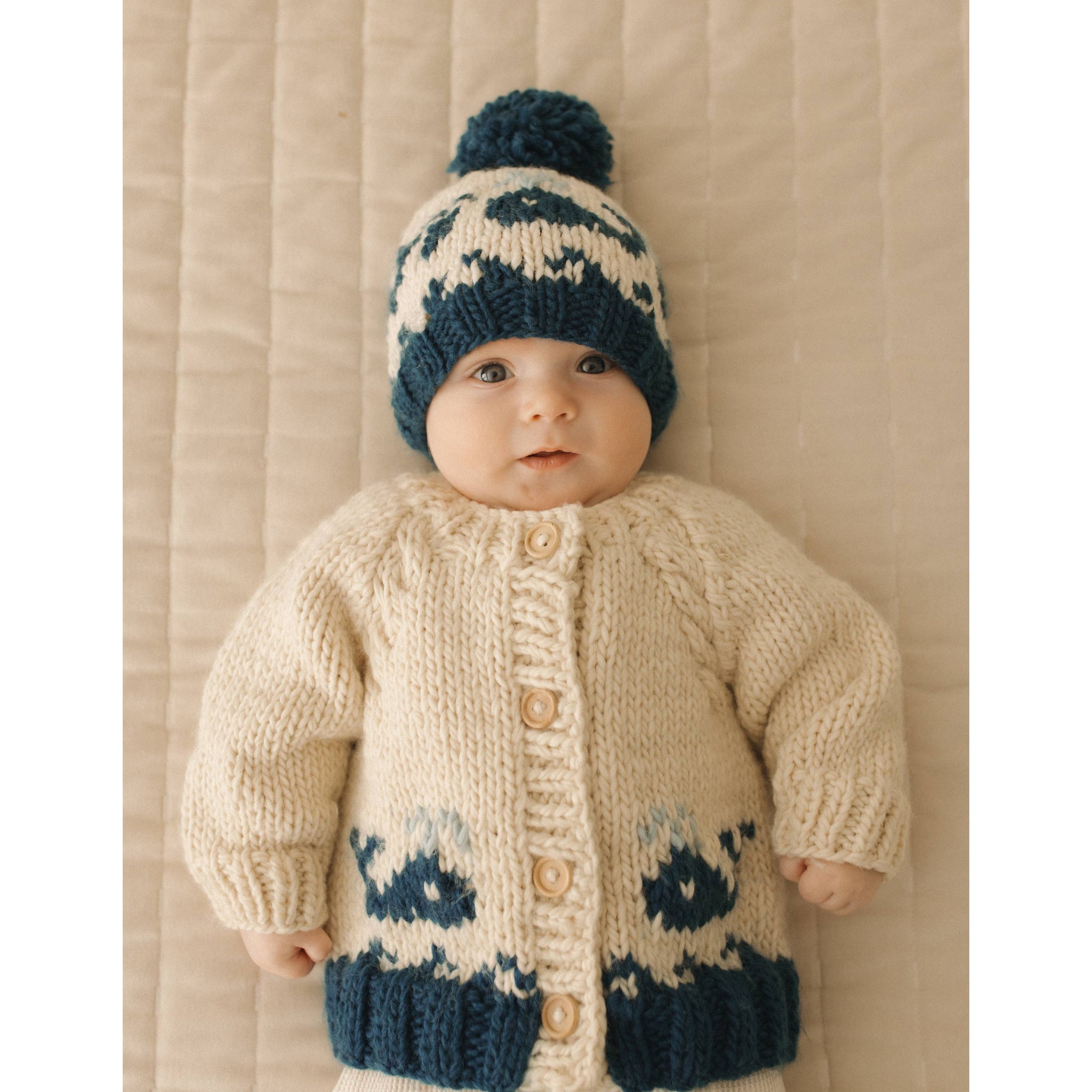 Here's a delightful hand knitted cardigan, adorned with charming blue whales with spouts of water swimming in water on a Natural hued background. This playful cardigan is designed with attention to detail, featuring natural wood buttons for closure and cable trimmed raglan sleeves Don't don't miss out on our matching whale beanie hat to complete the look. Our sweaters are partially knit from recycled, sustainable Polyester yarn made from plastic bottles. We are on a mission to help reduce the world's plastic pollution problem ♻ • 100% Acrylic • Cold handwash • Handknit in China
